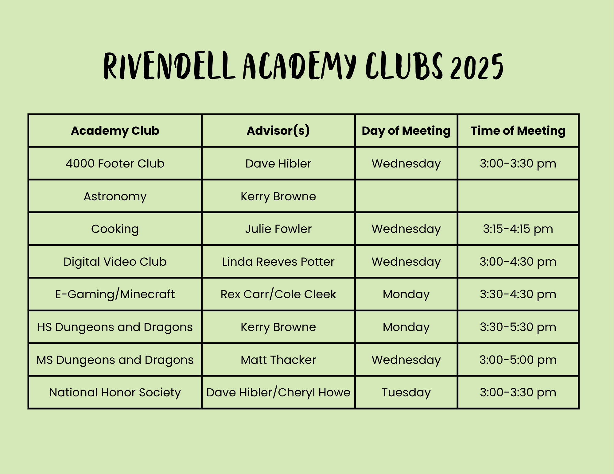 At Rivendell Academy students have the opportunity to participate in many co-curricular activities, including Minecraft Club, Eco Club, Dungeons and Dragons, Chorus, Knitting & Crochet Club, Leos Club (the youth division of the Lions Club), Makers Club, National Honor Society, National Technical Honor Society, Outing Club (including Cycling Club), Queer Straight Alliance (QSA), Robotics Club, Theater (Fall Production & Spring Musical), Ukulele Club, Fun Club, Digital Media Club, After-school Workout Club.